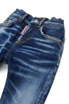 Vaqueros slim fit de color azul oscuro con pequeñas rozaduras. Tiene un corte entallado en toda la pierna. Practicidad y estilo se dan la mano en un denim pensado para acompañar cada momento del día con personalidad.
