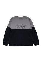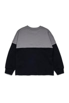 Sudadera bicolor de cuello redondo y manga larga con una construcción recortada típica de MM6. El diseño simula el ensamblaje de dos prendas deconstruidas y vueltas a montar, creando un look atrevido y contemporáneo, acentuado por el dobladillo de corte crudo.