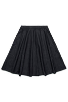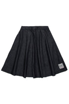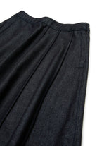 Falda midi de denim crudo oscuro con construcción de cuña y silueta acampanada, que le confiere un toque moderno y dinámico. Perfecta para una gran variedad de ocasiones, combina versatilidad y estilo con un diseño contemporáneo.
