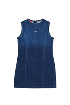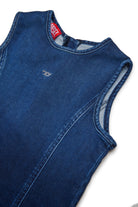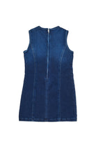 Vestido sin mangas en JoggJeans® azul oscuro, un diseño esencial pero rico en detalles distintivos. El lavado con matices de color en contraste aporta un acento moderno, perfecto para diversas ocasiones.