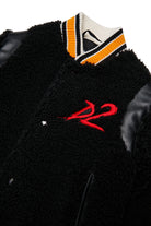 Chaqueta bomber de peluche con parche de oso bordado en la espalda. Un guiño irónico al mundo del terror y referencias a los salvajes bosques canadienses, un detalle que no pasará desapercibido.