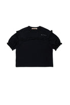 Camiseta de manga corta de suave jersey de algodón adornada con volantes en la parte delantera y las sisas. El logo institucional bordado en color de contraste en el lado del corazón añade un toque refinado a una prenda perfecta para diversas ocasiones.