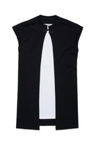Vestido midi de manga corta y cuello redondo confeccionado en jersey de algodón. Confección en forma de A que simula el ensamblaje de dos prendas previamente desestructuradas. Detalles de corte en crudo. Costura icónica en la espalda. Una prenda que encarna el ADN de MM6.