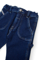 Jeans relaxed con costuras en contraste. El modelo presenta cinco bolsillos, denim azul con bordado decorativo en la parte trasera.