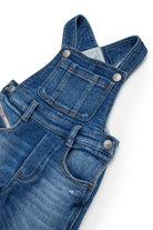 Peto largo en JoggJeans® azul medio con abrasiones. Una prenda con un atractivo atemporal, perfecta para un conjunto informal.