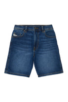 Shorts de denim azul medio con costuras en contraste y cinco bolsillos.