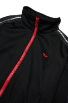Sudadera con cremallera completa, logo y bandas laterales en contraste en las mangas. El modelo presenta cremallera frontal y bajo cropped de estilo deportivo.