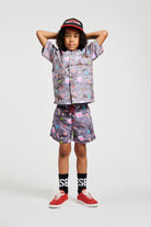 Bañador tipo bóxer con logo y estampado espacial colorido que aporta un toque vibrante a los días de playa