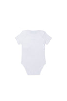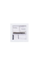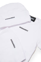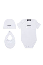 Conjunto de nacimiento en tejido de punto de canalé. Compuesto por body de manga corta, gorro y babero. Todos los artículos llevan la marca Dsquared2 con logotipo y están realizados en 100% algodón. El kit viene dentro de una caja de regalo.