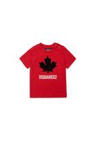 Camiseta de manga corta de suave jersey de algodón con logotipo Sport donde la hoja de arce canadiense, símbolo icónico del universo Dsquared2, se reinterpreta con un acabado flocado de efecto arruinado. Una prenda que combina estilo y practicidad.