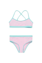 Bikini de licra con tirantes cruzados. Personalizado con logotipo institucional y dobladillo en contraste de color.