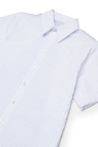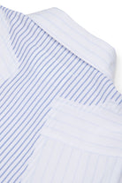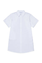 Vestido midi con logo y motivo de rayas verticales en algodón. El diseño presenta corte de camisa con mangas cortas y detalle de costuras en contraste en la parte posterior.