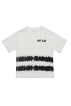 Camiseta de cuello redondo confeccionada con tejido deadstock y canalé en el cuello. Serigrafía con efecto tye-die en anverso y reverso representando el petróleo residual moviéndose en el mar.