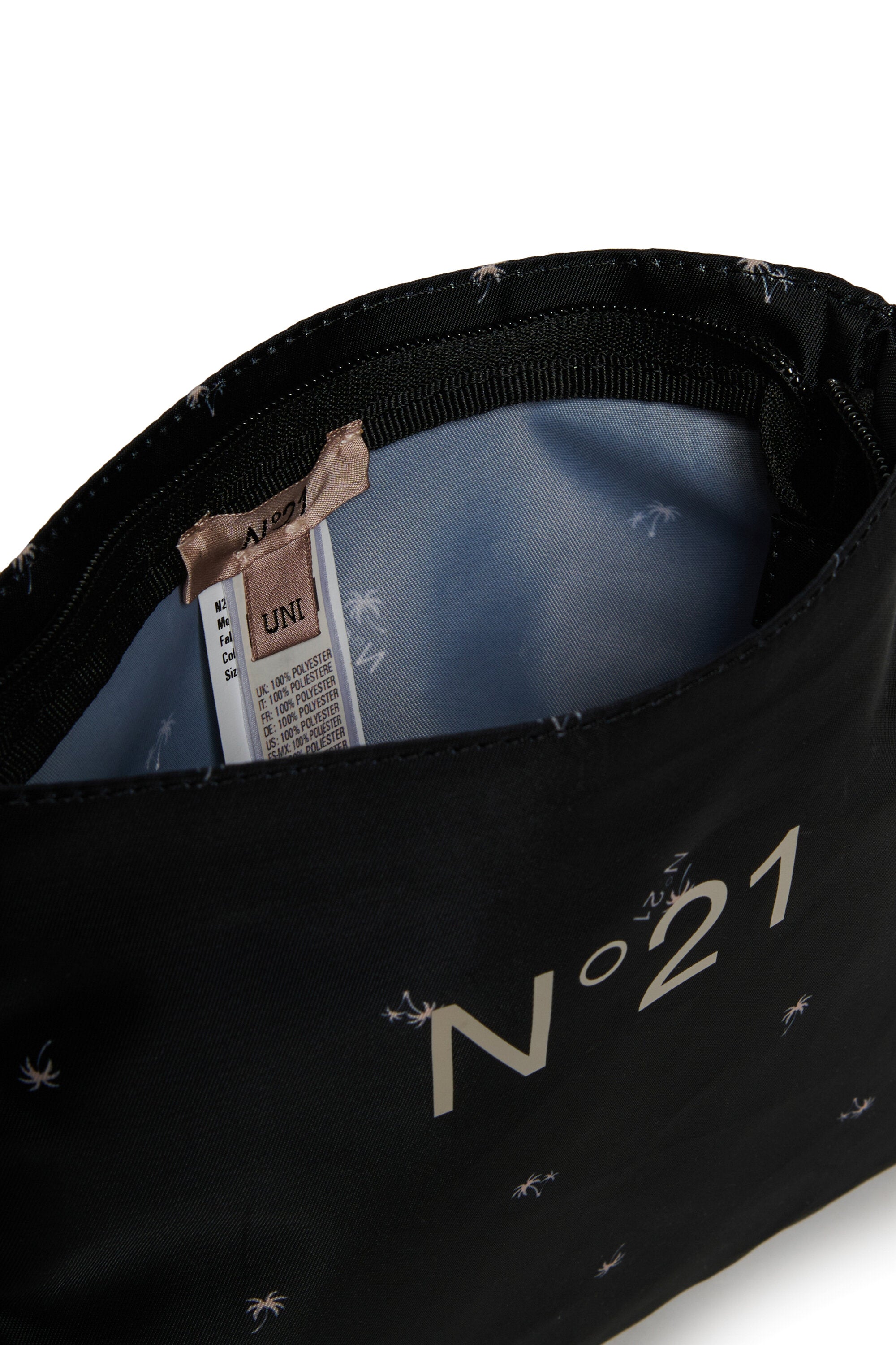 Bolso de mano de nylon con estampado en toda la superficie Palms. Logotipo institucional N°21 en un lado. Se lleva en la mano y cruzado. Bandolera ajustable. Medidas: 21 cm de alto, 21 cm de ancho. Caída del asa: 40 cm.