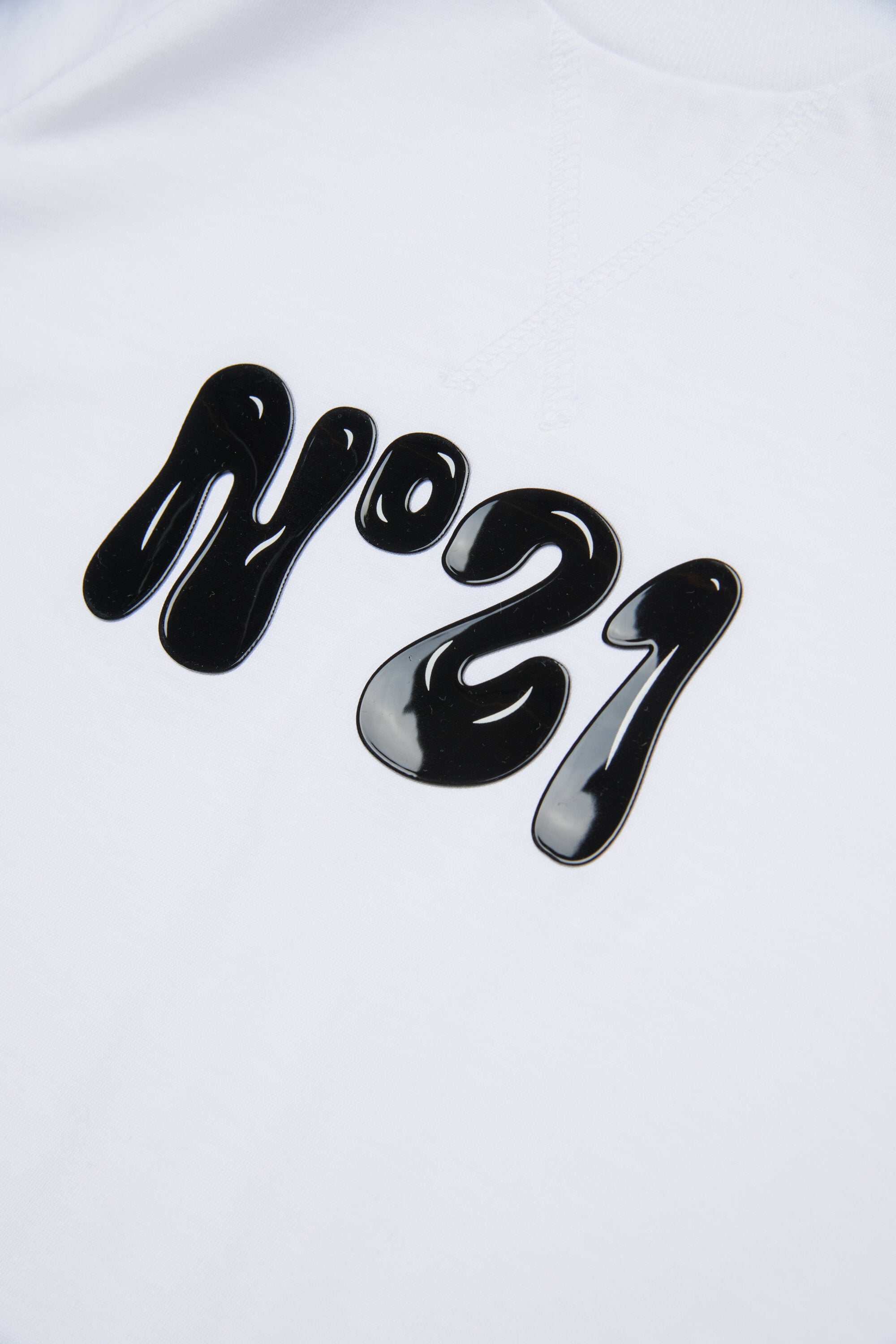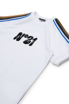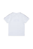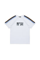 Camiseta en suave jersey de algodón con bandas multicolores a lo largo de las mangas. El contraste entre el estampado brillante del logotipo y los detalles deportivos hace que la prenda sea perfecta para los looks de diario.