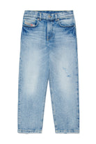 Regular fit jeans in light denim with a wrinkled effect and distressed details.