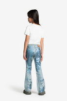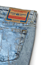 D-Arry bootcut fit jeans in marbled denim with mylar finishing with a pop attitude. A pattern that hugs the body from hips to knees with a wide flared bottom. A pop explosion of color with artfully created metallic whiskers to celebrate Diesel heritage.