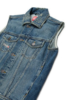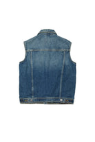 Denim vest with logo. The piece features a sleeveless construction, patch pockets on the chest, and a front button closure. The item is made from 100% cotton.
