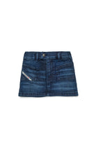 Short skirt in dark blue worn-effect denim. Perfect for a casual yet sophisticated outfit, it is easily matched with different styles.