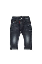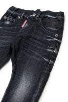 Five-pockets jeans. Made of black denim, distinguished by gradients and colour-contrasting whiskers. Turn-up bottom hem with inside-out effect. Dsquared2 label applied to the flap (flag logo).