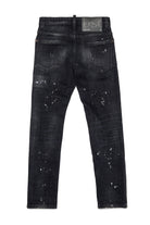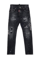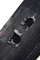 • Black denim with abrasions, rips, and paint splatter effect