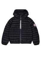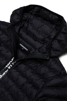 Padded jacket with contrasting printed logo on the closure and patch applied to the sleeve. A technical and lightweight model for outdoor use.