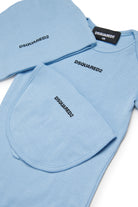 Birth set in micro ribbed knit. Consisting of a short-sleeved bodysuit, cap and bib. All items are branded with the Dsquared2 logo and made of 100% cotton. The kit comes inside a gift-box.