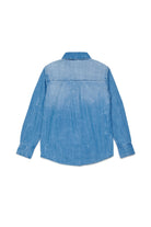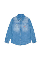 Denim shirt with logo on the chest pocket, featuring patch pockets and front buttons.