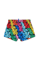 Boxer swim shorts with logo and multicolored graphic pattern.