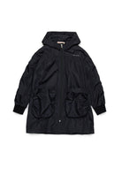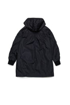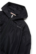 Long windbreaker jacket made of nylon. Features gathers that characterise the garment. Institutional logo embroidered in contrasting color on the front on the heart side. Fixed hood. Front zip closure. Front pockets. Elastics on cuffs. Lined inside.