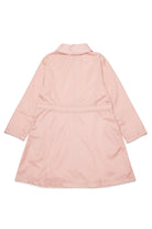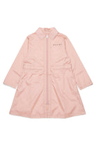 Long jacket with printed logo and zip closure, embellished with front pockets and contrasting stitched details.