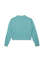 Cropped crew-neck long-sleeved pullover made of a rib knit wool blend. Localized breaks on the neck, sleeves and bottom give it a worn and authentic effect. Perfect for adding character to any look, even for special occasions.