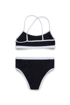 Lycra bikini swimming costume with crossed shoulder straps. Customised with institutional logo and contrasting color hem.