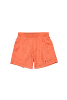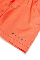Short boxer swim trunks with logo on the hem. Essential beachwear design with technical details.