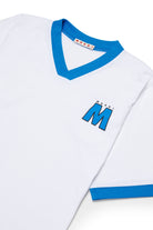 T-shirt with printed logo made of 100% cotton. Features a V-neck design and contrasting trims on the collar and sleeves.