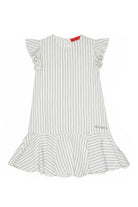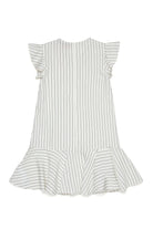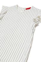 Short dress with logo and pleated flounce detail, featuring a vertical stripe pattern and ruffled sleeves.