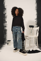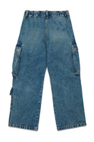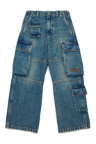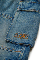 Mid-blue shaded cargo jeans with Numeric logo embroidered in contrasting color on one of the garment's signature pockets. A workwear inspiration for a contemporary, personality-packed look.