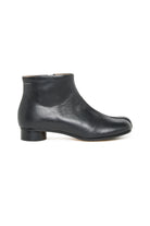 Low leather boots with a cylindrical heel and embossed stitching on the toe. Designed to elegantly accompany every step, from everyday to more formal occasions.