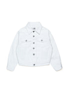 Long-sleeved jeans jacket. Clean-looking white denim. Margiela 6 logo embroidered in tone on the back. Welt pockets and small pockets on the front. Front button closure. Iconic seam at back. Made of 100% cotton.
