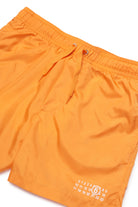 Nylon boxer costume. Short length. Drawstring waist. Numeric logo in contrasting color on front and back. Mesh inner briefs. Front welt pockets. Back pocket. Iconic seam at back.