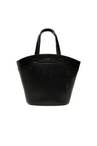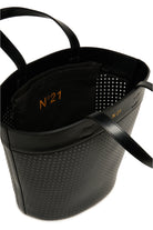 Perforated coated fabric shopper bag with handles. N°21 Institutional logo on one side. Drawstring bag in canvas on the inner. Measurements: 27 cm high, 22 cm wide, 13 cm deep. Handle drop: 15 cm.