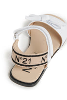 Sandals with logoed elastic N°21 on the back. Belt with strap. Bow at the top. Calf leather upper and inner lining. Leather-rubber sole. Made in Italy.