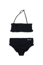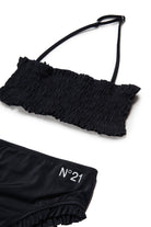 Bikini with printed logo and ruffled edges, featuring a ruched bandeau top and briefs with ruched details.